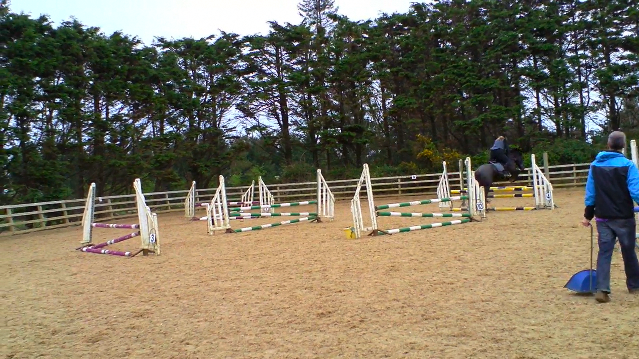 Connell wouldn’t pull up. I couldn’t get him on the correct lead. We went all the way down the arena, then I got him going, then he changed leads on me — thanks, dude — then I got it back, then we came around, he hesitated before 3, Shite, I thought, then he bucked halfway to 4, I tapped him up, and over we went — but he knocked the poles, argh! and then I headed to 5 — and then when I landed I was like Wait a minute —
