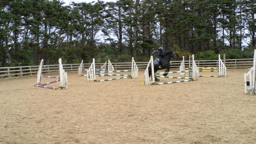 Ooh, sticky, I thought as I struggled to get Con to strike off correctly. At least I am getting better at feeling it. The fences seemed — well, they were high, but they didn’t seem unmanageable. We took 1 — he had bucked and squealed as we headed for it, there was a bit of hesitation as we took it, so I used all that time between 1 and 2 to get our rhythm to improve.