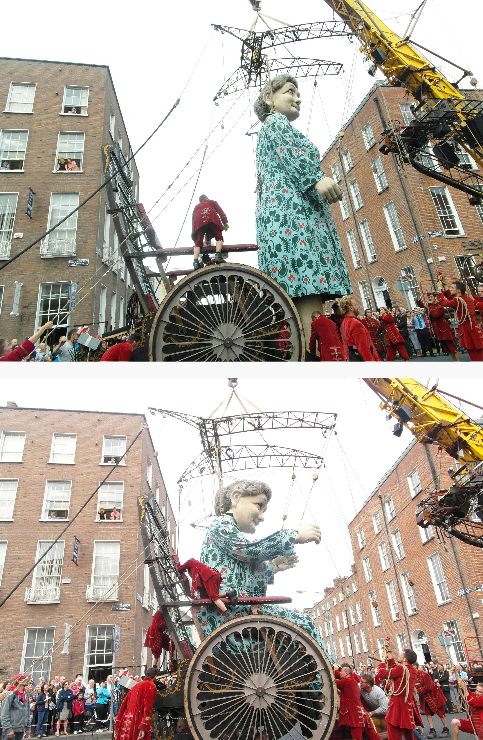 Another holds a cable, pulling it, tensing, dropping down to her haunches, then releasing. It was a lengthy, rhythmic movement, it didn’t happen at every step — I know this because that’s where I ended up, walking along beside the crane, alongside the pavement, mostly in the street. There were a few others with me, with the majority of the crowd content to watch it all go by. I kept going, because — because I could? Because it didn’t make sense not to see as much as I was able? It never even occurred to me to stay in one place.
